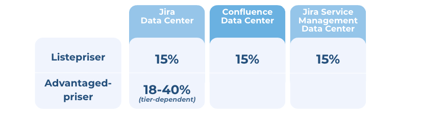 Derudover stiger advantaged‑priserne for Jira Software Data Center med 18–40 %, afhængigt af jeres brugertier. Det betyder, at historiske, rabatterede planer nu bringes op på niveau med den standard listepris, som nye kunder allerede betaler.